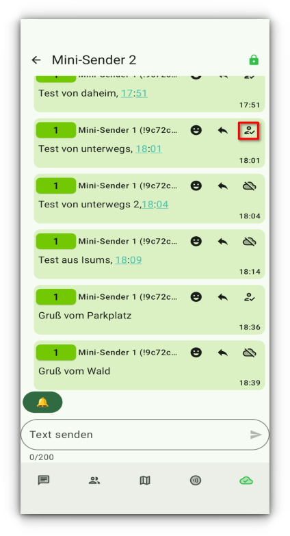 Vielleicht habe ich die Reichweite etwas überschätzt. Den einen Tracker habe ich auf unseren Dachboden gebracht und auf einen alten Kleiderschrank abgelegt, um an Höhe zu gewinnen und die Reichweite zu verbessern. Mit dem anderen Tracker bin ich durch die Gegend gezogen und habe private Chat-Nachrichten gesendet, denn dann sieht man in der App anhand des Symbols, ob die Nachricht zugestellt werden konnte. Das hat manchmal geklappt, dann sieht man ein Symbol mit einer Person mit Haken dran (rot umrandet im Screenshot). Andernfalls zeigt sich eine durchgestrichene Wolke, die anzeigt, dass kein Node gefunden und die Nachricht nicht gesendet werden konnte.